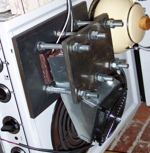 A test of the thermoelectric generator on an electric range burner which has been turned on high. You can't see it but the fan is spinning like crazy!